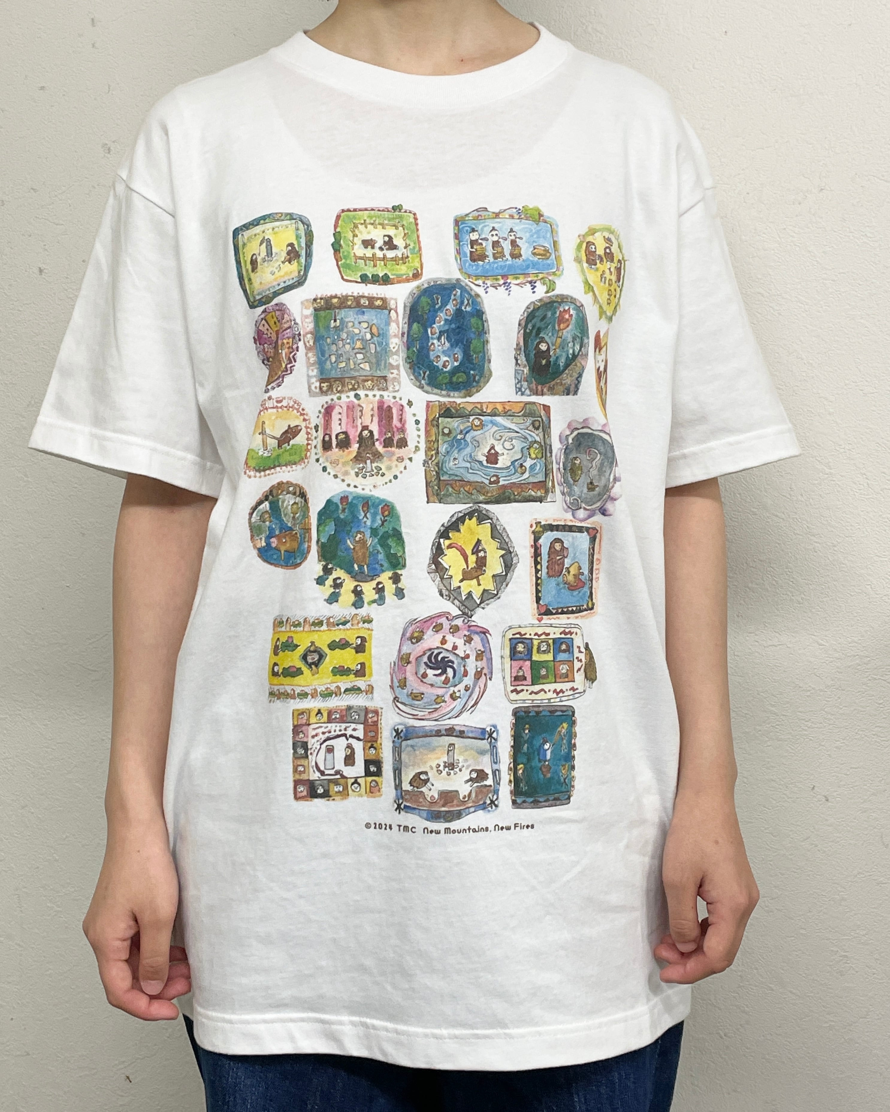 Tシャツ《新たな山、新たな火》は、アニメーション作品の構想から生まれた「再生と鎮静の祈り」をテーマにしています。